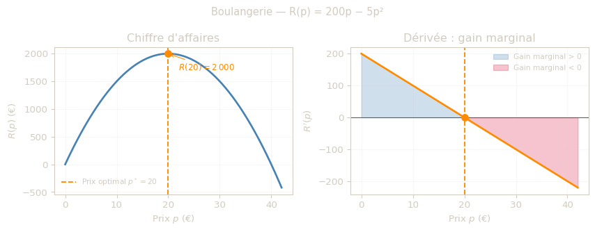 Le graphique ci-dessous illustre le cas de la boulangerie : à gauche le chiffre d’affaires \(R(p)\), à droite sa dérivée \(R'(p)\) qui mesure le gain marginal.