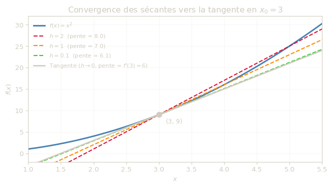 Utilisez le curseur pour faire varier \(h\) et observez comment la pente de la sécante se rapproche de \(f'(3) = 6\).