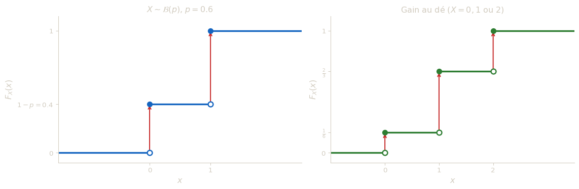 Dans le cas discret, la fonction de répartition n’est pas continue sur \(\mathbb{R}\) ; elle est cependant continue à droite.