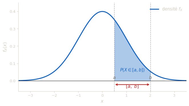 Cette définition est le cœur de tout le chapitre. Elle établit un dictionnaire de traduction entre probabilités et intégrales : calculer la probabilité que \(X\) prenne une valeur dans \([a, b]\) revient à calculer l’aire sous la courbe de \(f_X\) entre \(a\) et \(b\).