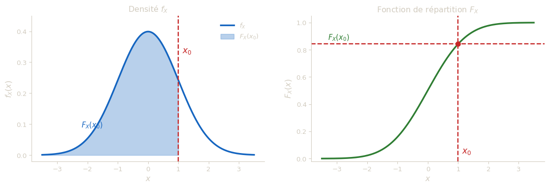La fonction de répartition de la v.a.r. \(X\) de densité \(f_X\) est la fonction \(F_X : \mathbb{R} \to [0\,;\,1]\) définie par : \[F_X(x) = P(X \leq x) = \int_{-\infty}^x f_X(t)\,dt.\]