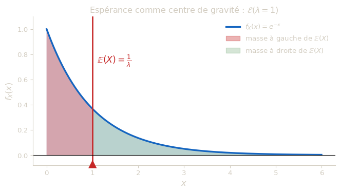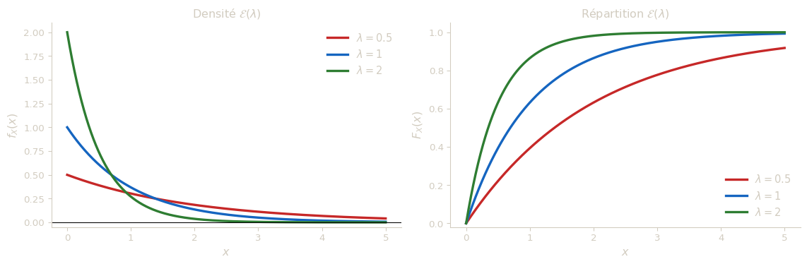 2. \(X \sim \mathcal{E}(\lambda)\) : la densité est \(f(x) = \lambda e^{-\lambda x}\,\mathbf{1}_{[0;+\infty[}(x)\).