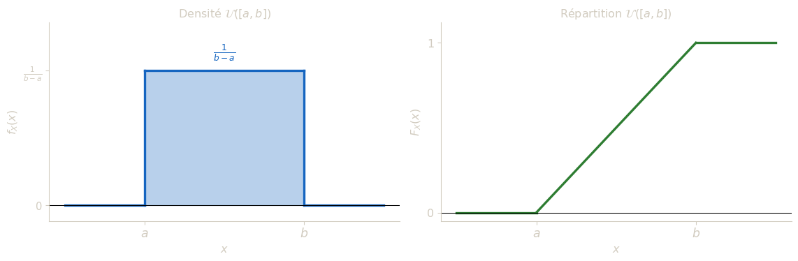 Cette notation compacte sera utilisée tout au long du chapitre pour écrire les densités de probabilité : au lieu de définir une fonction par morceaux avec des accolades, on multiplie l’expression de la densité par \(\mathbf{1}_I(x)\), qui « active » la fonction uniquement sur l’intervalle \(I\) et l’annule partout ailleurs. Par exemple, écrire \(f(x) = \frac{1}{b-a}\,\mathbf{1}_{[a\,;\,b]}(x)\) signifie que \(f\) vaut \(\frac{1}{b-a}\) sur \([a, b]\) et \(0\) ailleurs.
