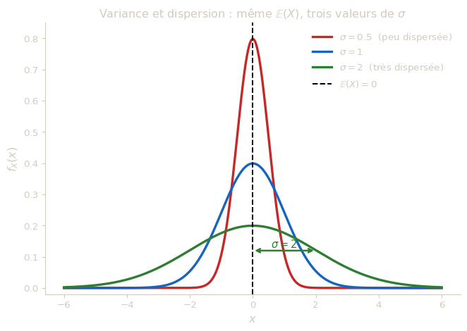 Ces trois outils hérités du calcul intégral classique s’étendent sans difficulté aux intégrales généralisées à condition que les intégrales impliquées convergent. En pratique, on les applique d’abord sur un intervalle borné \([a, X]\), puis on passe à la limite \(X \to +\infty\) (ou \(X \to -\infty\)). La linéarité permet de décomposer des intégrales complexes en sommes plus simples ; l’intégration par parties transforme un produit difficile à intégrer directement ; le changement de variable permet de se ramener à une intégrale connue ou plus simple. Ces techniques seront systématiquement utilisées dans le calcul d’espérances et de variances en section III.